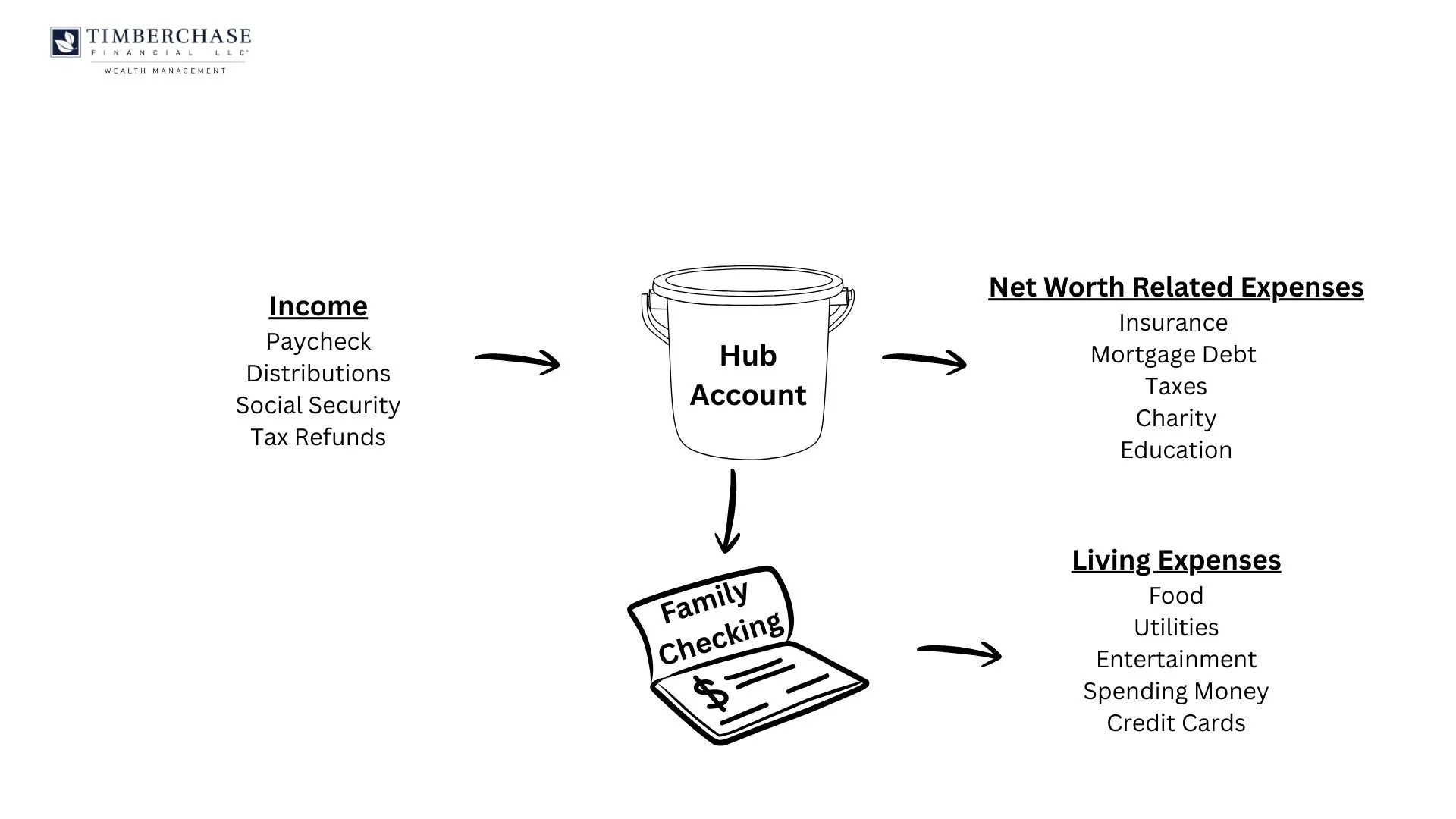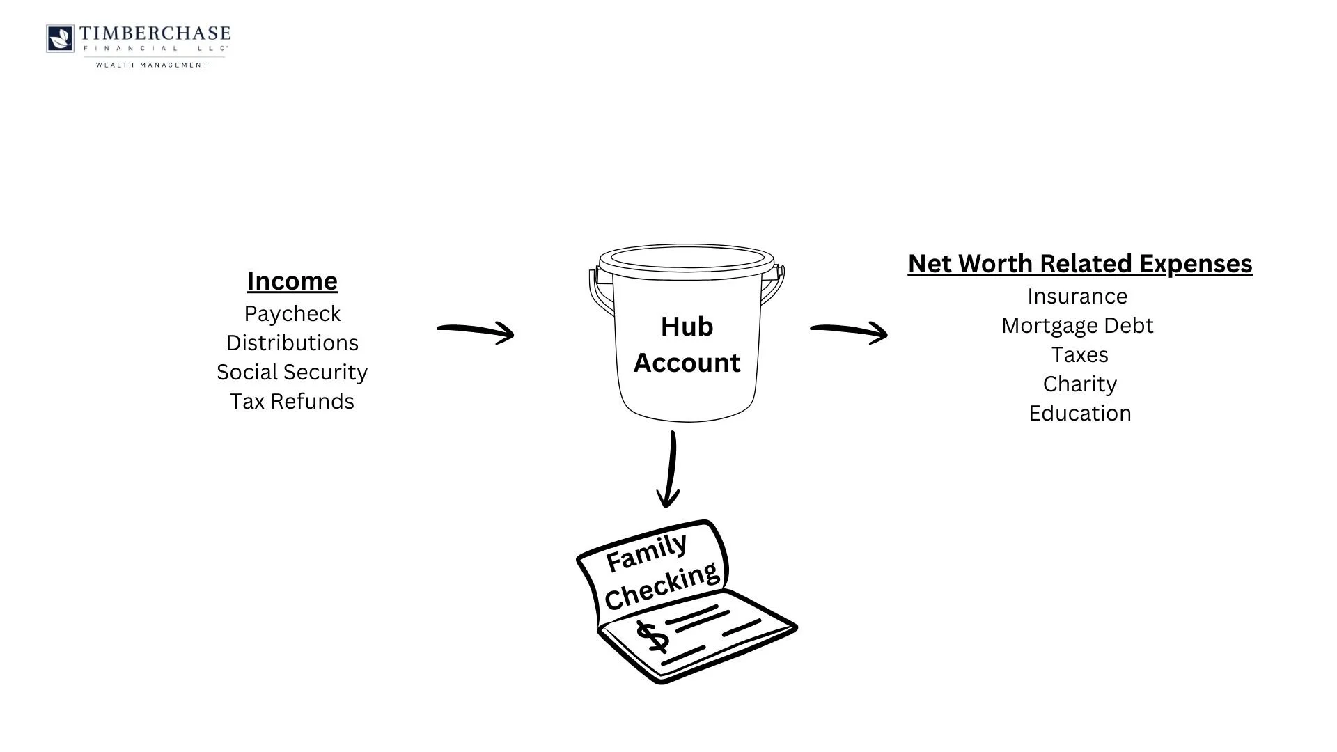All income—paychecks, bonuses, retirement distributions, business dividends, inheritance—lands in the Hub first. From there you take care of net-worth and tax items: investing (all accounts), taxes including property tax, all insurance, medical premiums & expenses, college/private school/529, HSA contributions, and debt payments (including the mortgage but not consumer debt). Those are mission-critical decisions about protection and growth; they don’t belong in the same account that buys takeout.