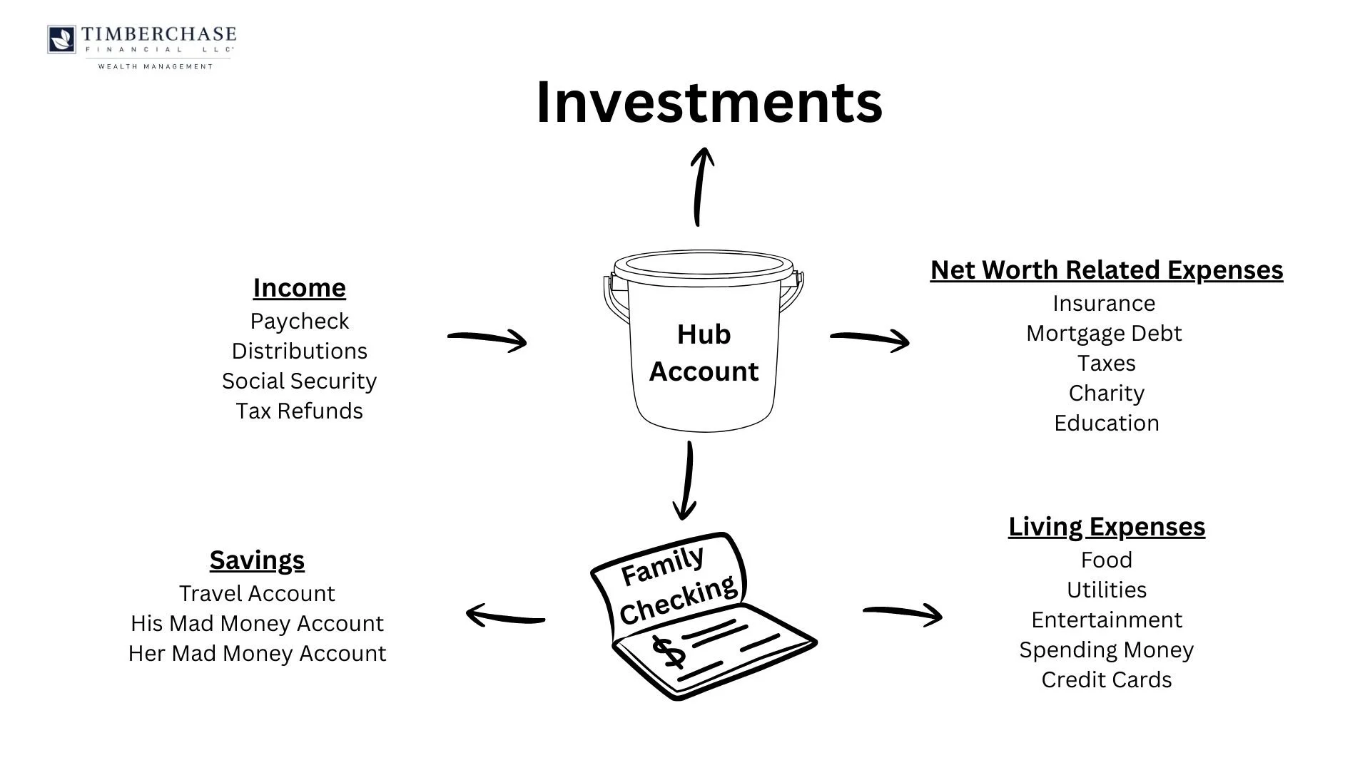The Hub can be thought of as a “runway.” Some hold three to six months of expenses there, others more or less depending on comfort and upcoming needs. There isn’t a single right number. The goal is visibility: you can see if your runway is trending up or down and make adjustments without touching your lifestyle cadence. The runway helps with future investing decisions.
