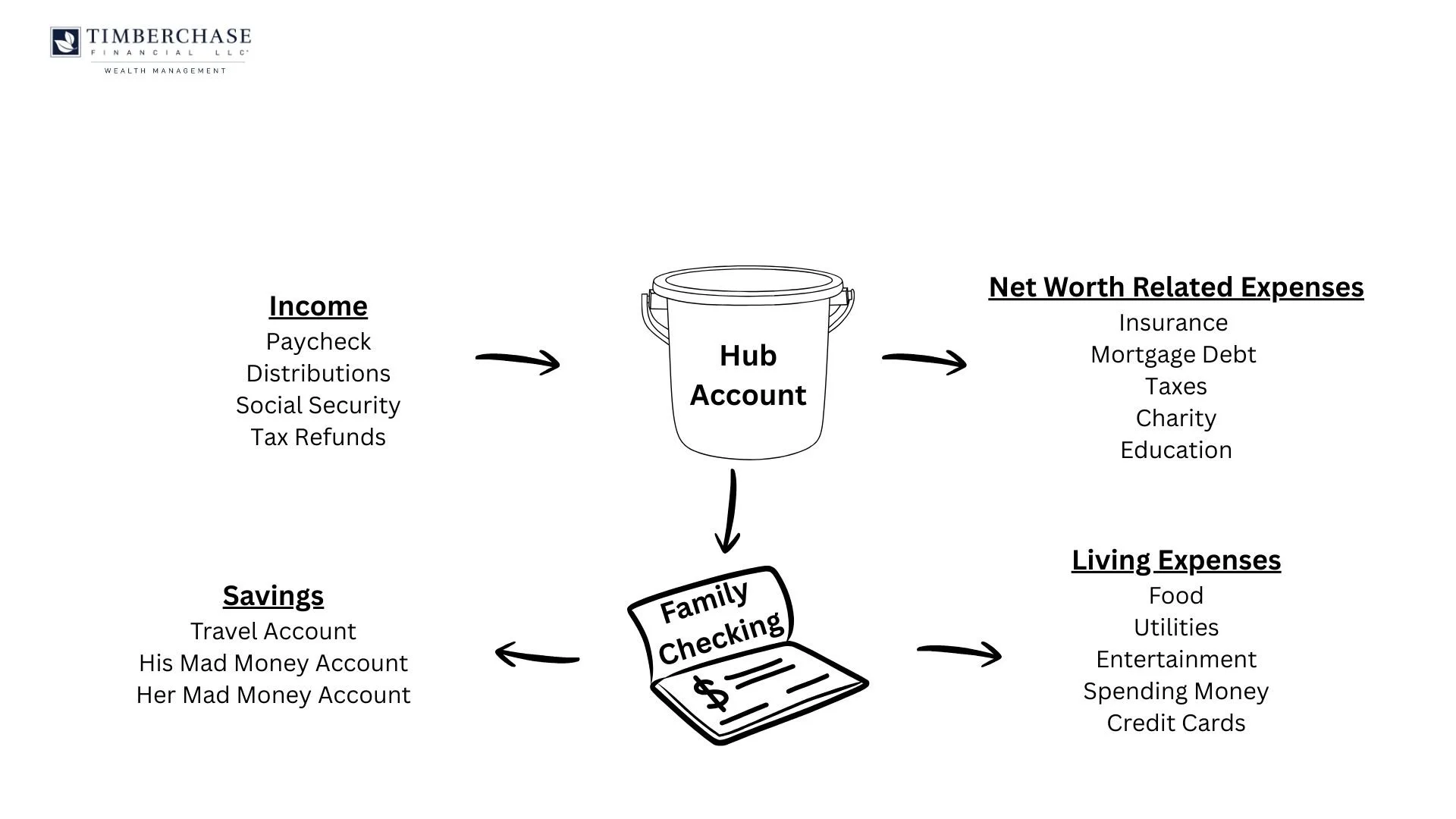 Step one: redirect all income to the Hub and link the Hub and Family Checking so transfers are easy both ways.